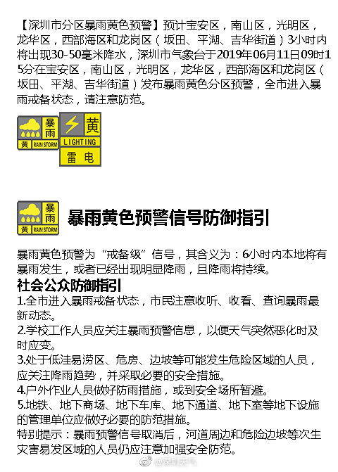 【深圳市分區(qū)暴雨黃色預(yù)警】預(yù)計(jì)寶安區(qū),南山區(qū),光明區(qū),龍華區(qū),西部海區(qū)和龍崗區(qū)(坂田、平湖、吉華街道)3小時(shí)內(nèi)將出現(xiàn)30-50毫米降水,深圳市氣象臺于2019年06月11日09時(shí)15分在寶安區(qū),南山區(qū),光明區(qū),龍華區(qū),西部海區(qū)和龍崗區(qū)(坂田、平湖、吉華街道)發(fā)布暴雨黃色分
