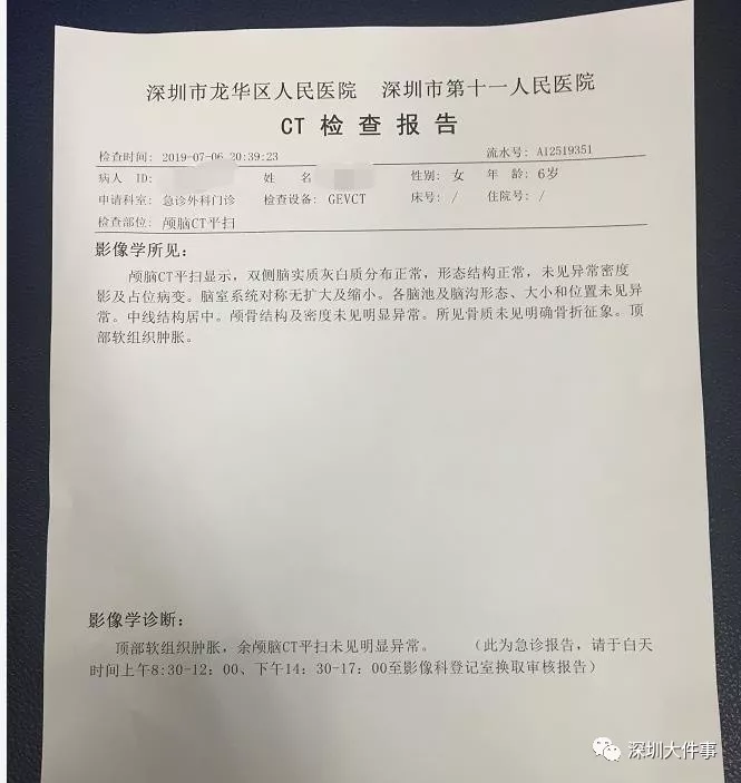 據(jù)市民李女士報(bào)料稱(chēng),7月6日晚上8時(shí)許,在龍華區(qū)弓村一巷一位6歲女童被樓上掉下的瓶子砸中頭部,血流不止。隨后女童被父母送往附近社康醫(yī)治,但因傷口太深社康無(wú)法治療,遂被送往龍華人民醫(yī)院救治。