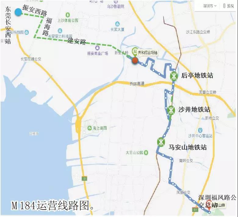 途經(jīng)道路包括:福鳳路、鳳凰山大道、鳳凰立交、鳳塘大道、中心路、南環(huán)路、寶安大道、新和大道、沙松路、北亭路、大埔北路、大埔中路、新和大道、沙井路、向興路、大興一路、新和大道、建安路、福海路、振安西路。