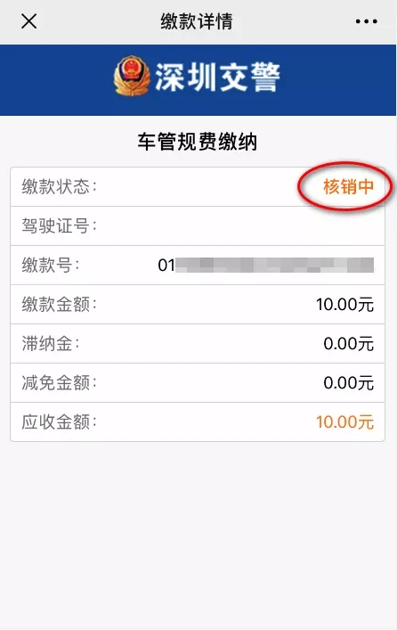 03 提交繳費后,核對繳款號(前面會多01),應收金額為10元。繳費后再次查詢該流水,狀態(tài)為“核銷中”(即繳費成功)。