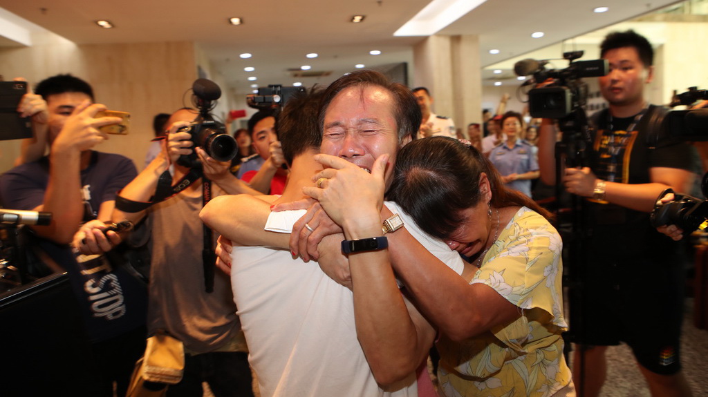 7、7月18日上午,在深圳市公安局刑事偵查局和福田分局的幫助下,尋子18年的余氏夫婦在深圳市刑偵局技術(shù)處一樓見到了兒子,團(tuán)聚現(xiàn)場余氏夫婦將兒子緊摟懷中,淚流滿面。