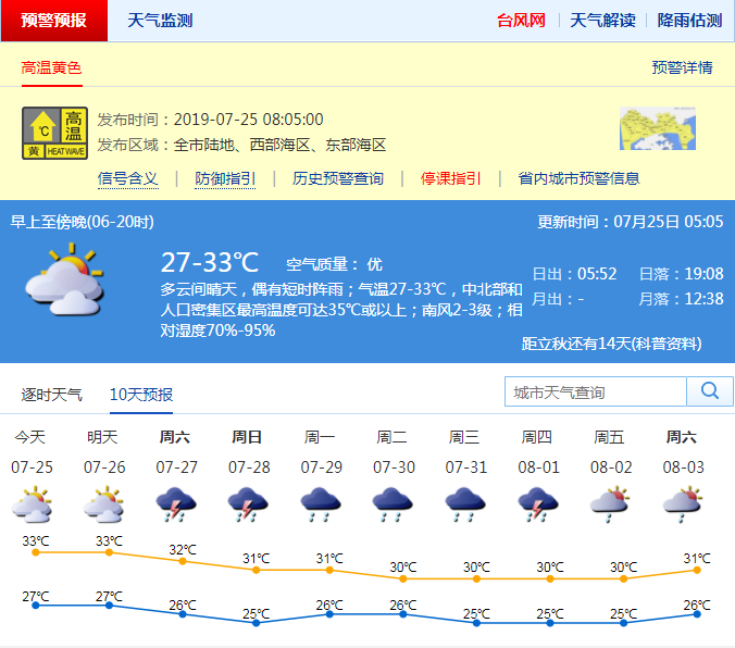 深圳新聞網(wǎng)2019年7月25日訊 市氣象局預(yù)計(jì)今日深圳多云間晴天,偶有短時(shí)陣雨;氣溫27-33℃,中北部和人口密集區(qū)最高溫度可達(dá)35℃或以上;南風(fēng)2-3級;相對濕度70%-95%。26日多云,天氣炎熱;27-28日有雷陣雨,部分時(shí)間雨勢較大;29-31日多云,有雷陣雨,局部最大可達(dá)暴雨。