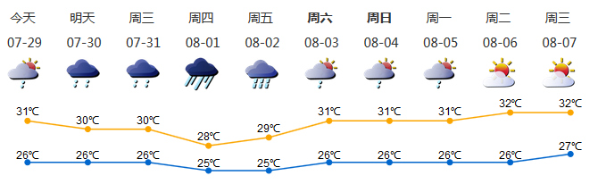 預(yù)計(jì)30-31日陰天間多云,有陣雨或雷陣雨,局部暴雨;8月1日 -2日有一次暴雨降雨過程。8月3日 -5日降雨減弱,多云有陣雨或雷陣雨。