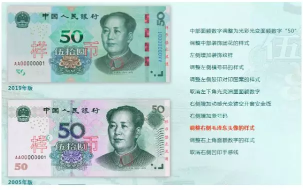 2019年版第五套人民幣50元、20元、10元、1元紙幣分別保持2005年版第五套人民幣50元、20元、10元紙幣和1999年版第五套人民幣1元紙幣規(guī)格、主圖案、主色調、“中國人民銀行”行名、國徽、盲文面額標記、漢語拼音行名、民族文字等要素不變,提高了票面色彩鮮亮度,優(yōu)化了票面結構層次與效果,提升了整體防偽性能。2019年版第五套人民幣50元、20元、10元、1元紙幣調整正面毛澤東頭像、裝飾團花、橫號碼、背面主景和正背面面額數字的樣式,增加正面左側裝飾紋樣,取消正面右側凹印手感線和背面右下角局部圖案,票面年號改為“2019年”。
