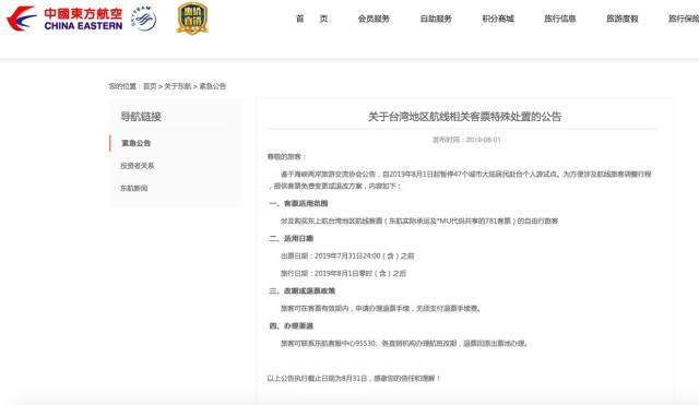 繼深航之后,東航也剛剛發(fā)布了關于臺灣地區(qū)航線相關客票特殊處置的公告:涉及購買東航臺灣地區(qū)航線客票(東航實際承運及*MU代碼共享的781客票)的自由行旅客,出票日期在2019年7月31日24:00(含)之前,旅行日期在2019年8月1日零時(含)之后的,旅客可在客票有效期內(nèi),申請辦理退票手續(xù),無須支付退票手續(xù)費。
