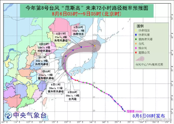 預計,“范斯高”將以每小時25-30公里的速度繼續(xù)向西北方向移動,將于今天晚上再次登陸韓國南部,爾后逐漸轉(zhuǎn)向東北方向移動,強度逐漸減弱。