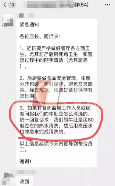 這張聊天截圖顯示:前晚7點(diǎn)54分,八合里的一個(gè)內(nèi)部群,發(fā)出了一則緊急通知,要求店長(zhǎng)、廚師長(zhǎng)近期要做好餐廳各方面衛(wèi)生,后廚要做好食品安全管理。如果有食藥監(jiān)局工作人員或顧客詢問(wèn),牛肚是怎么清洗的,統(tǒng)一回復(fù)的話術(shù)是:我們的牛肚是用80度左右的熱水清洗,然后用高壓水槍沖磨來(lái)完成清洗的。