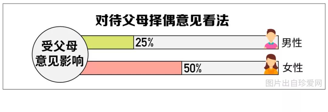 面對(duì)父母的擇偶建議,50%的女性會(huì)受到父母意見影響,僅25%的男性會(huì)受到影響,可見,女性比男性更“聽媽媽的話”。另外,從地域來看,“本地土著”青年更容易受到父母的影響。