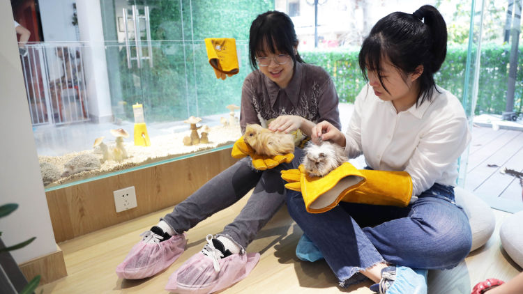 除了小動物和飼養(yǎng)員們,這里還聚集了許多年輕女孩兒,她們有的相互認(rèn)識,輪流跟店里的小浣熊撓癢癢拍照;有的不認(rèn)識彼此,卻因?yàn)轱曫B(yǎng)過同樣的小動物而熟絡(luò)起來,相互傳授養(yǎng)育自家"孩子"的經(jīng)驗(yàn)。這只名為"六一"的小浣熊是這里的常駐小動物,面對市民們的熱情,"六一"毫不客氣地躺在小姐姐的臂彎里撒嬌,引來其他市民們爭相拍照。