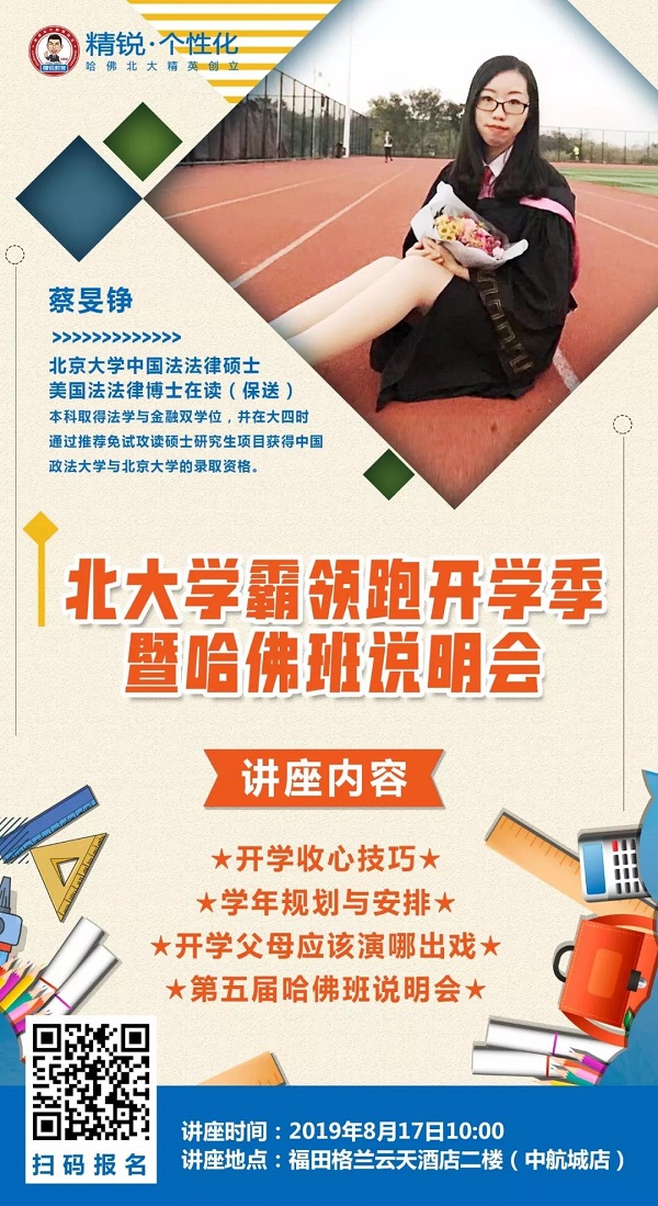 為了幫助深圳的孩子擺脫假期綜合征,快速適應(yīng)新年級(jí)帶來的變化,《北大學(xué)霸領(lǐng)跑開學(xué)季》公益講座特別邀請(qǐng)到北大學(xué)霸蔡旻錚學(xué)姐于本周六和深圳的家長(zhǎng)、學(xué)生分享開學(xué)收心技巧,如何做好學(xué)年規(guī)劃與安排。