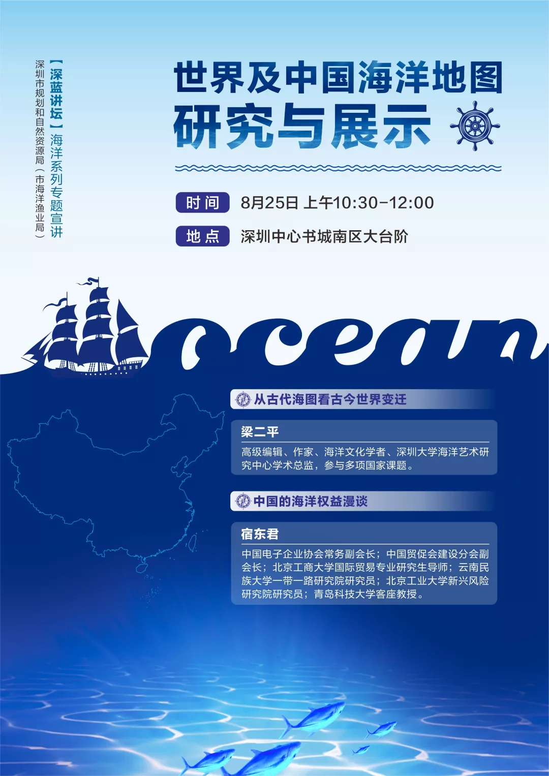 麥哲倫完成了第一次環(huán)球航行、哥倫布發(fā)現(xiàn)了新大陸、迪亞士最早探險至非洲最南端好望角、達伽馬開辟了通往印度的新航線…… 2000多年前,在茫茫大海上 裝備簡陋的航海者 取暖靠抖、通訊靠吼 沒有網(wǎng)絡、沒有手機、沒有GPS …… 卻能在廣闊無邊的大海中 找到心之所向的目的地 這是因為 他們有一張神奇的圖——海圖 梁二平:從古代海圖看古今世界變遷 世界上這一次又一次的航海大發(fā)現(xiàn),或者是由黃金、白銀、香料、瓷器、黑奴貿易等所引發(fā)的大侵略、大移民、大變革,都在一張小小的圖中展現(xiàn)得淋漓盡致。 大航海時代早期,西班牙、葡萄牙稱霸海洋,出盡了風頭,靠的就是海圖。后來英國擊敗荷蘭,意識到光靠戰(zhàn)爭是控制不了海洋的,更重要的是海洋知識。于是,英國設立了一個水文部,專門進行測量和制作海圖。這便是一代“海上霸主”崛起的關鍵。 每一幅海圖 都承載著豐富的地理、社會及歷史信息 不同時代、地域,不同文化背景下的海圖繪制者 對空間有著不同的理解 描繪世界的方式也有所不同 海圖一步一步從文字描述到精確標注 東西方海圖相互交融發(fā)展 為海洋變遷提供了真實的見證 一張小小的海圖 卻扮演著舉足輕重的“角色” 其實,它也和海洋權益 也有著密不可分的關系 宿東君:中國的海洋權益漫談 談及主權問題 我們總是滿懷著一腔熱血 看紀錄片時 海上時不時會漂浮著一個個小浮標 想知道小浮標對海洋科技考察有什么作用? 中國先驅又是如何歷盡艱難險阻 主張屬于中國的海洋權益的? 想知道引發(fā) 南海問題、釣魚島問題的“來龍去脈”嗎? 以上的種種疑問 都將在8月25日的“”深藍講壇” 一同為你揭曉! “深藍講壇” 2017年5月,《全國海洋經濟發(fā)展“十三五”規(guī)劃》明確提出推進深圳建設全球海洋中心城市,在投融資、服務貿易、商務旅游等方面進一步提升對外開放水平和國際影響力,打造成為“21世紀海上絲綢之路”的排頭兵和主力軍;2018年9月,市委市政府印發(fā)《關于勇當海洋強國尖兵加快建設全球海洋中心城市的決定》及實施方案;2019年,深圳創(chuàng)建全球海洋中心城市納入到《粵港澳大灣區(qū)規(guī)劃發(fā)展綱要》和《關于支持深圳建設中國特色社會主義先行示范區(qū)的意見》。 為讓社會了解這一重要政策,計劃通過開展“深藍講壇”專題系列活動,通過專家講授、市民互動等活動,請市民對我市海洋發(fā)展政策、主要目標和實施路徑等建言獻策,在擴大影響面的同時收集好的意見和建議,以更好地推動我市海洋各項工作的順利開展,為我市創(chuàng)建全球海洋中心城市營造氛圍,奠定思想基礎。 現(xiàn)在,“深藍講壇”專題系列活動真的來了! 8月25日 以“世界及中國海洋地圖研究與展示”為主題 2019年首場“深藍講壇”海洋系列專題宣講活動 即將拉開帷幕