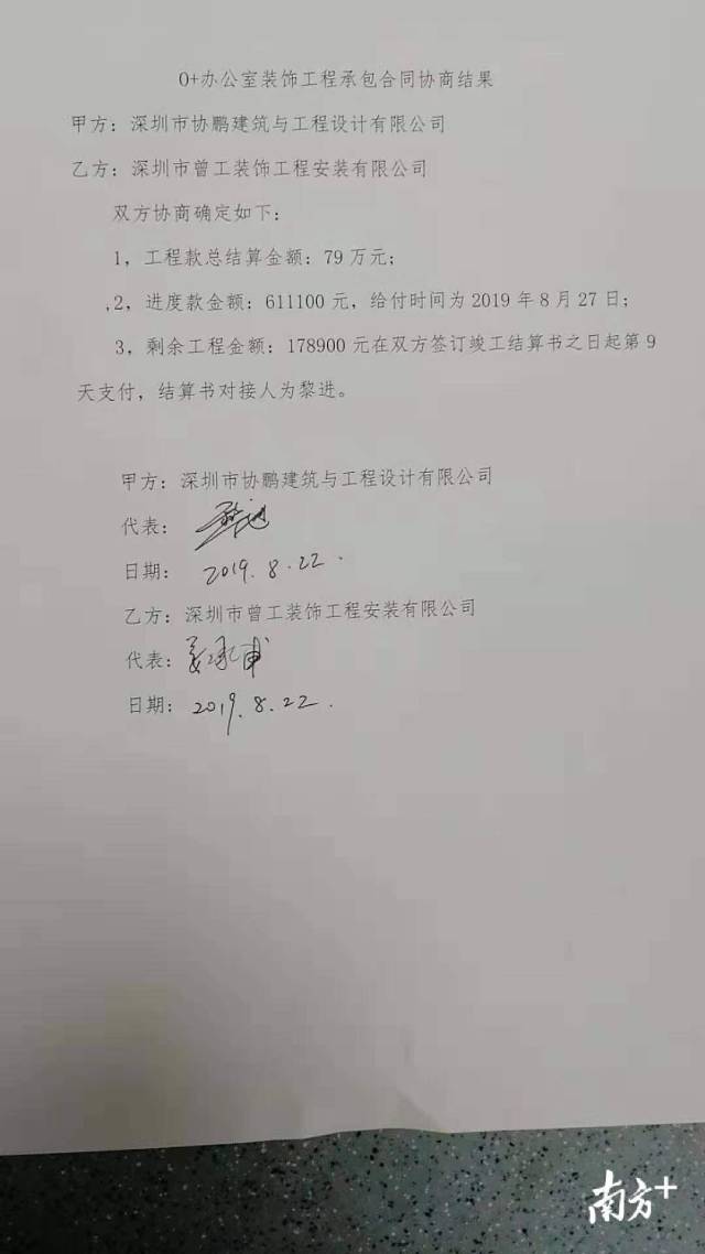 南方網(wǎng)2019年8月28日訊 去年11月,田先生承包下福田卓越城一期O+智慧平臺(tái)的室內(nèi)裝修工程。工程完工至今近半年,卻一直沒(méi)收到總包方深圳市協(xié)鵬建筑與工程設(shè)計(jì)有限公司(以下稱(chēng)協(xié)鵬建筑)的余款共計(jì)84余萬(wàn)元,臨近開(kāi)學(xué),工人們都急著交學(xué)費(fèi),公司也無(wú)法正常運(yùn)營(yíng)。