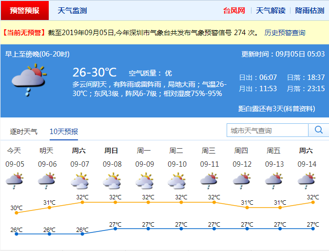 見(jiàn)圳客戶端、深圳新聞網(wǎng)2019年9月5日訊 今年14號(hào)臺(tái)風(fēng)“劍魚”(熱帶風(fēng)暴級(jí))3日17時(shí)減弱為熱帶低壓后,其風(fēng)力進(jìn)一步減弱,已難以確定其環(huán)流中心,中央氣象臺(tái)于4日2時(shí)停止對(duì)其編號(hào)。市氣象臺(tái)于4日8時(shí)30分取消臺(tái)風(fēng)白色預(yù)警信號(hào)。盡管如此,受“劍魚”減弱后低壓槽影響,今日我市有大雨局部暴雨,沿海、海區(qū)和高地陣風(fēng)6-7級(jí);6日降雨減弱;7日起轉(zhuǎn)多云,有短時(shí)陣雨,天氣炎熱。