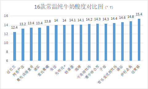 8款國產(chǎn)牛奶酸度在13~15°T之間。8款進口牛奶中紐麥福全脂純牛奶的酸度15.4°T,紐仕蘭牧場全脂牛奶酸度12.4,其它6款也是13~15°T之間。其中,紐仕蘭、網(wǎng)易嚴選、晨光供港壹號、德亞酸度較低,表明新鮮度和熱穩(wěn)定性較好。