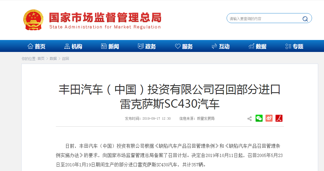 日前,豐田汽車(中國)投資有限公司根據(jù)《缺陷汽車產(chǎn)品召回管理條例》和《缺陷汽車產(chǎn)品召回管理條例實施辦法》的要求,向國家市場監(jiān)督管理總局備案了召回計劃。決定自2019年10月11日起,召回2005年5月23日至2010年1月19日期間生產(chǎn)的部分進口雷克薩斯SC430汽車,共計357輛。