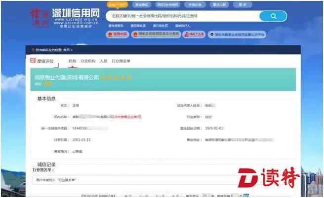 用戶登錄“深圳信用網(wǎng)”,只需根據(jù)頁面指示搜索相關(guān)鍵字,查詢頁面即可查到房地產(chǎn)中介機構(gòu)的注冊備案地址、注冊時間、星級評價以及誠信記錄等信息。