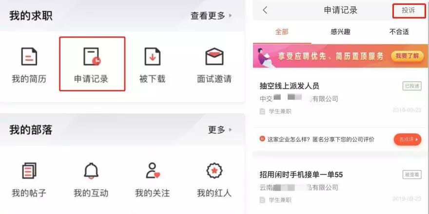 網(wǎng)站設(shè)定的投訴規(guī)則是:從自己申請過的求職記錄里選取投訴對象。