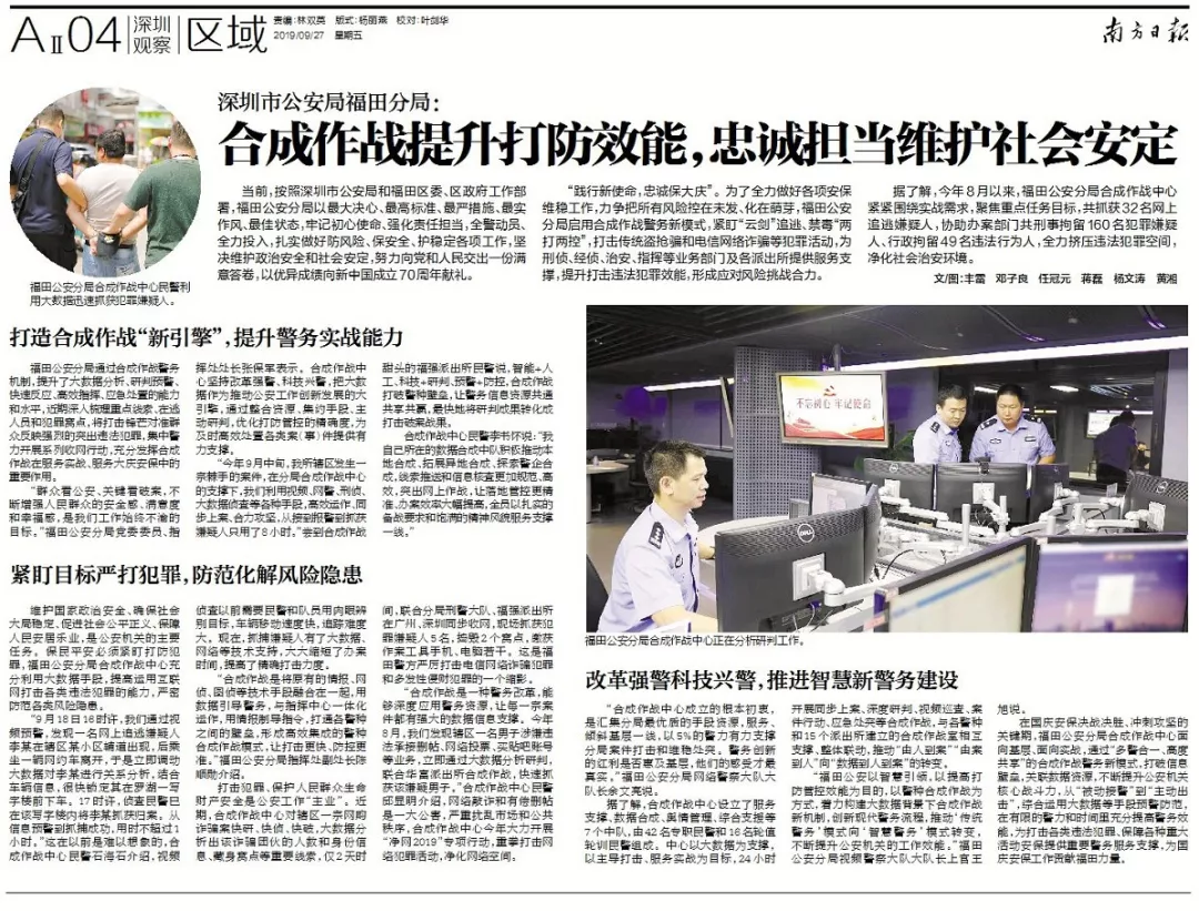踐行新使命,忠誠保大慶。為了全力做好各項(xiàng)安保維穩(wěn)工作,力爭(zhēng)把所有風(fēng)險(xiǎn)控在未發(fā)、化在萌芽,福田公安分局啟用合成作戰(zhàn)警務(wù)新模式,緊盯“云劍”追逃、禁毒“兩打兩控”,打擊傳統(tǒng)盜搶騙和電信詐騙以及“颶風(fēng)”行動(dòng)等專項(xiàng)行動(dòng),為刑偵、經(jīng)偵、治安、指揮等業(yè)務(wù)部門及各派出所服務(wù)支撐,提升打擊違法犯罪效能,形成應(yīng)對(duì)風(fēng)險(xiǎn)挑戰(zhàn)合力。