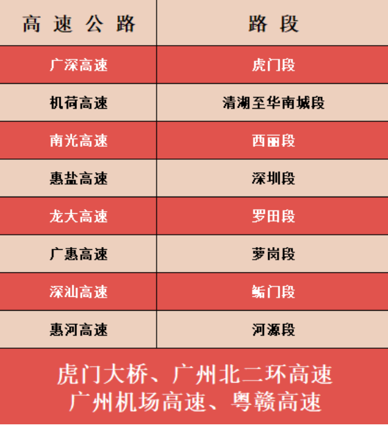 深高速預(yù)計(jì),出深車流自9月30日陸續(xù)開(kāi)始,高峰主要集中在10月1日的8點(diǎn)至22點(diǎn),其中14點(diǎn)至17點(diǎn)尤為集中;節(jié)后返程車流預(yù)計(jì)集中在10月6~7日的2點(diǎn)至22點(diǎn),其中15點(diǎn)至20點(diǎn)尤為集中。廣東省內(nèi)車流密集容易發(fā)生擁堵的有以下路段: