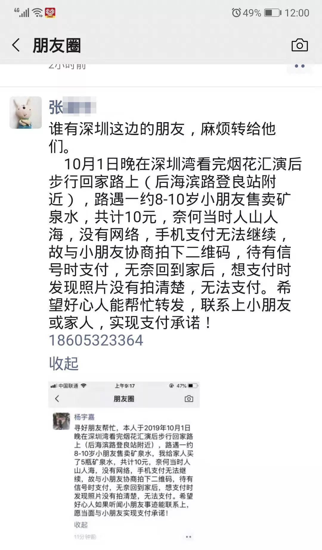 “10月1日晚,在深圳灣看完煙花表演后步行回家路上,路遇一約8-10歲小朋友售賣礦泉水,共計(jì)10元,奈何當(dāng)時(shí)人山人海,沒有網(wǎng)絡(luò)信號,手機(jī)無法支付,故與小朋友協(xié)商拍下二維碼,待有信號時(shí)支付,無奈回到家后,想支付時(shí)發(fā)現(xiàn)照片沒有拍清楚,無法支付。希望好心人能幫忙轉(zhuǎn)發(fā),聯(lián)系上小朋友或家人,實(shí)現(xiàn)支付承諾!”