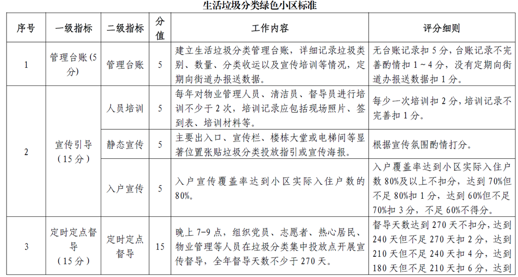 分類成效顯著的住宅區(qū),可認(rèn)定為“生活垃圾分類綠色小區(qū)”。獲獎(jiǎng)小區(qū)將通報(bào)表揚(yáng)并按照10萬元/1000戶的標(biāo)準(zhǔn)補(bǔ)助,不足1000戶的,每減少100戶,補(bǔ)助資金減少5%,超過1000戶的,每增加100戶,補(bǔ)助資金增加5%,最高補(bǔ)助不超過30萬元,補(bǔ)助資金僅用于生活垃圾分類相關(guān)的設(shè)施采購、宣傳培訓(xùn)以及勞務(wù)補(bǔ)貼等方面;生活垃圾分類綠色小區(qū)的物業(yè)服務(wù)企業(yè)可優(yōu)先申報(bào)深圳市級(jí)綠色物業(yè)管理評(píng)價(jià)標(biāo)識(shí),通過市住房建設(shè)部門審核后獲得綠色物業(yè)管理評(píng)價(jià)補(bǔ)助資金。