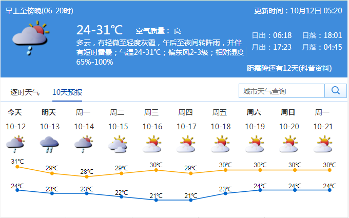 見圳客戶端·深圳新聞網(wǎng)2019年10月12日訊 據(jù)深圳市氣象臺消息,今日深圳多云,有輕微至輕度灰霾,午后至夜間轉(zhuǎn)陣雨,并伴有短時雷暴;氣溫24-31℃;偏東風(fēng)2-3級;相對濕度65%-100%