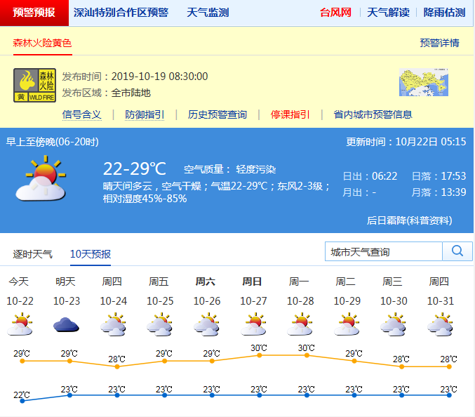 見圳客戶端·深圳新聞網(wǎng)2019年10月22日訊(見圳客戶端、深圳新聞網(wǎng)記者 施冰冰)最近深圳的天氣,早晚有點入秋的涼爽,可午后溫度依然不低。昨天白天,全市晴天間多云,早晨最低氣溫21-23℃,部分地區(qū)最高氣溫超過了33℃。天氣干燥,全市森林火險黃色預警信號生效中。