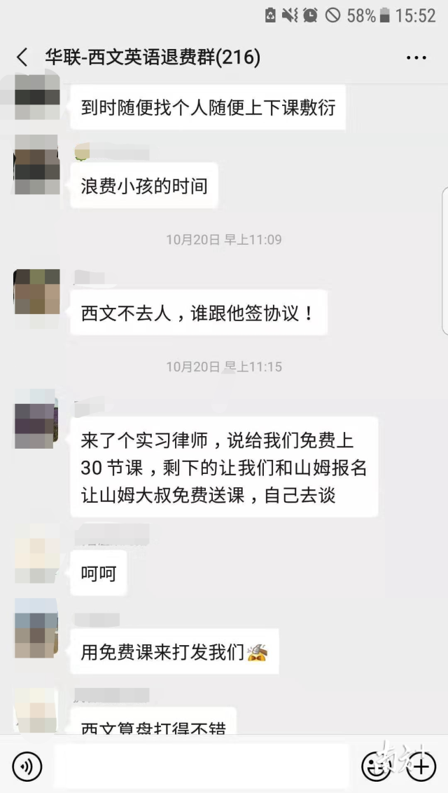 退費群里的周女士介紹,10月20日,西文英語提供了一份“英語培訓課程三方協(xié)議書”,但上面很多條款都沒有寫清楚。西文英語委托的律師稱,山姆大叔少兒英語愿意給西文英語的學員免費提供30節(jié)課程,但學員在西文英語其他剩余課時的解決方案,需自行和山姆大叔協(xié)商。