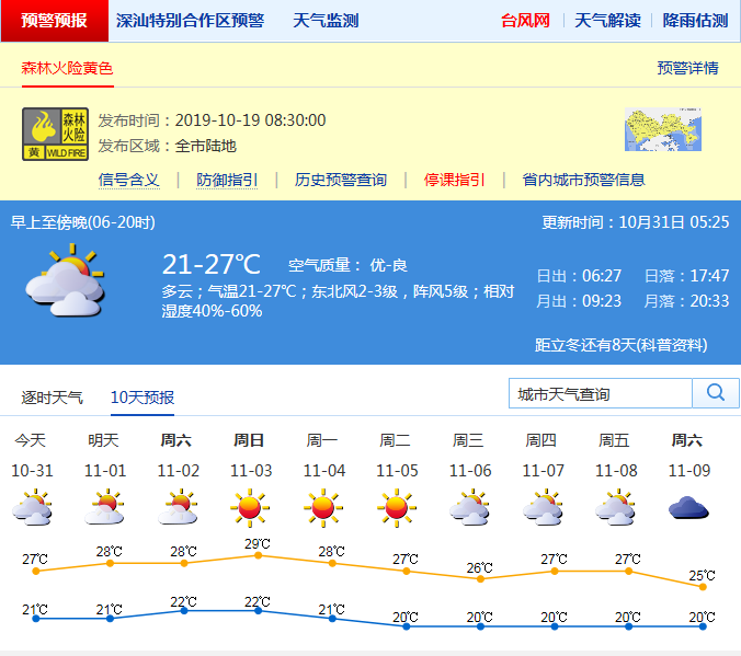 市氣象局預計31日多云,氣溫21-27℃,東北風2-3級,陣風6級;相對濕度40%-75%。未來一周天氣持續(xù)干燥,晝夜溫差加大,早晚清涼。森林火險黃色預警信號持續(xù)生效中。