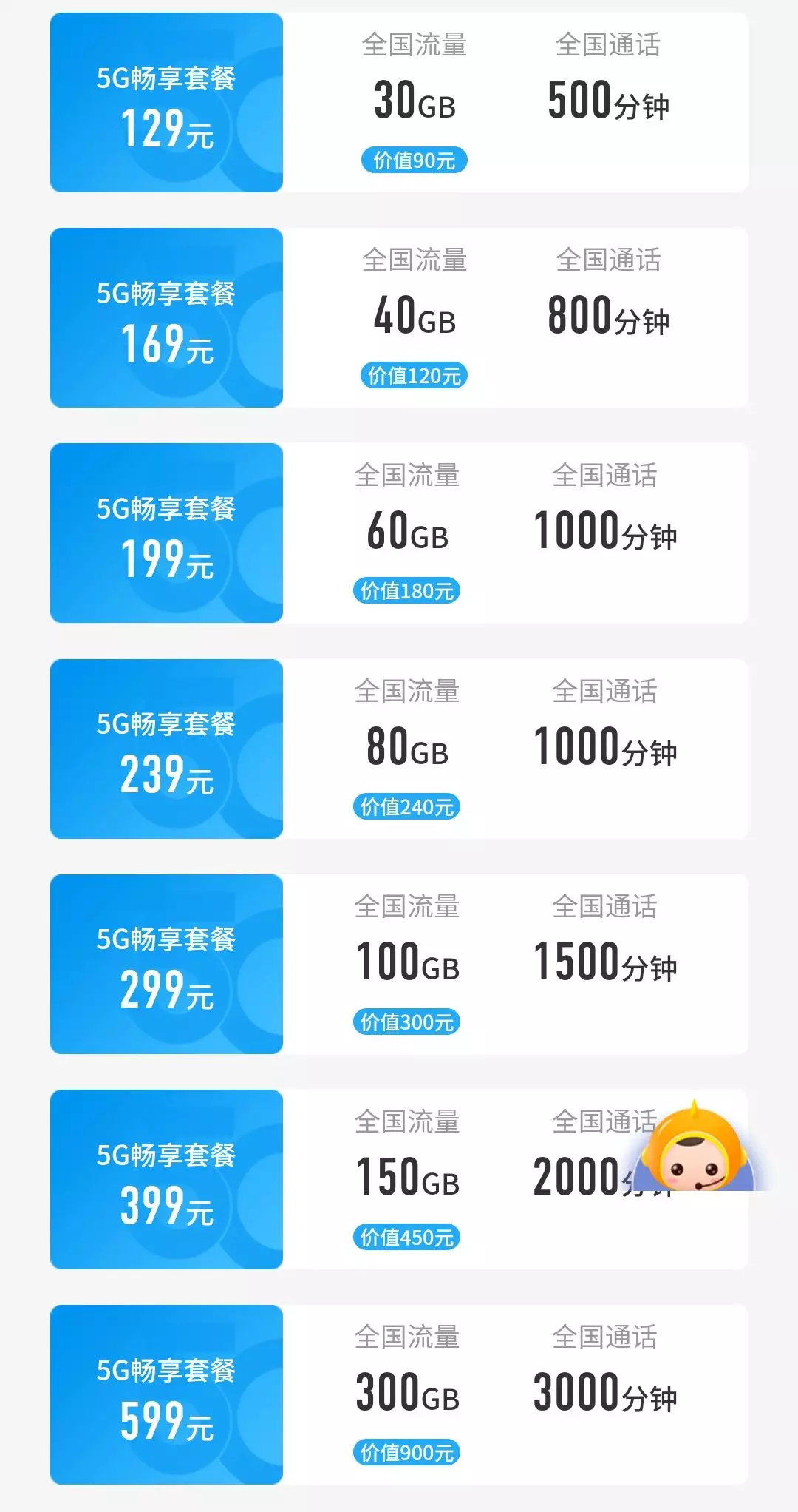 299元套餐:100G流量,1500分鐘通話時(shí)間