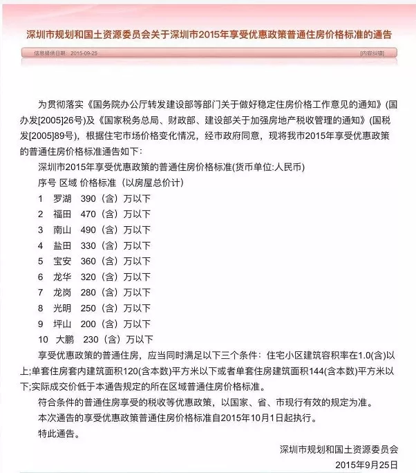 2015年,深圳普通住房標(biāo)準(zhǔn)出臺,規(guī)定南山總價(jià)在490萬以上、福田總價(jià)在470萬、羅湖總價(jià)在390萬以上的房源均屬于豪宅,需要按照豪宅的標(biāo)準(zhǔn)交稅。