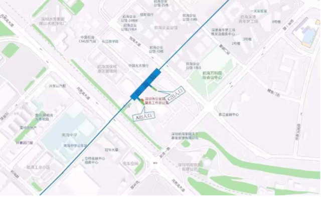 怡海站位于怡海大道與月亮灣大道中間,車站出入口共計4個,B、D出入口預(yù)留,A出入口接光大銀行,連接怡海大道,C出入口前海展廳旁,連接A號公路