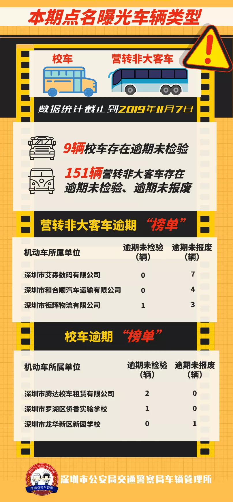 見圳客戶端·深圳新聞網(wǎng)2019年11月14日訊 據(jù)“深圳交警權(quán)威發(fā)布”微信公眾號消息,部分企業(yè)、駕駛?cè)撕鲆暟踩珕栴},對名下“逾期車輛”遲遲不處理,存在著重大安全隱患。深圳交警繼續(xù)針對重點(diǎn)隱患車輛點(diǎn)名曝光,數(shù)據(jù)統(tǒng)計(jì)截止到2019年11月7日,9輛校車存在逾期未檢驗(yàn),151輛營轉(zhuǎn)非大客車存在逾期未檢驗(yàn)、逾期未報(bào)廢。