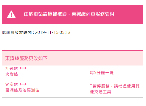 港鐵于今早05:05發(fā)布通告稱,港鐵各線列車服務(wù)延誤或受阻,經(jīng)詳細(xì)風(fēng)險評估及相關(guān)政府部門商討后,港鐵各線(機(jī)場快線除外)、輕鐵及港鐵巴士的服務(wù)將于晚上10時結(jié)束。由頭班車起,東鐵線大學(xué)至羅湖及落馬洲站暫時關(guān)閉,列車也不停相關(guān)車站。
