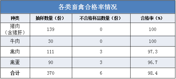 畜禽類(lèi)產(chǎn)品6份不合格樣品中,禽肉和禽蛋分別檢出3份樣品不合格。