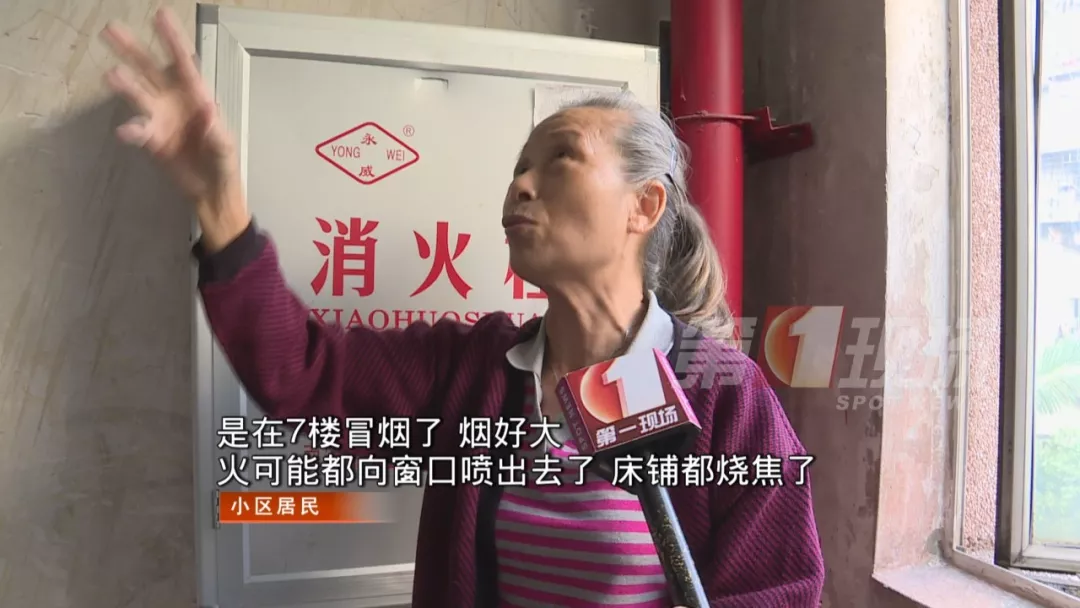 記者到達現(xiàn)場時,火勢已被消防救援人員撲滅,樓里的居民正在清理救火時留下的水跡。據(jù)居民介紹,著火的房子位于7樓,是一間出租屋,里面還住了不少人。