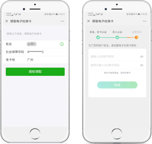 根據(jù)提示授權(quán)領(lǐng)取電子社??ǎ⑦M行實人實名認證后,設(shè)置電子社??艽a,即可完成領(lǐng)取。