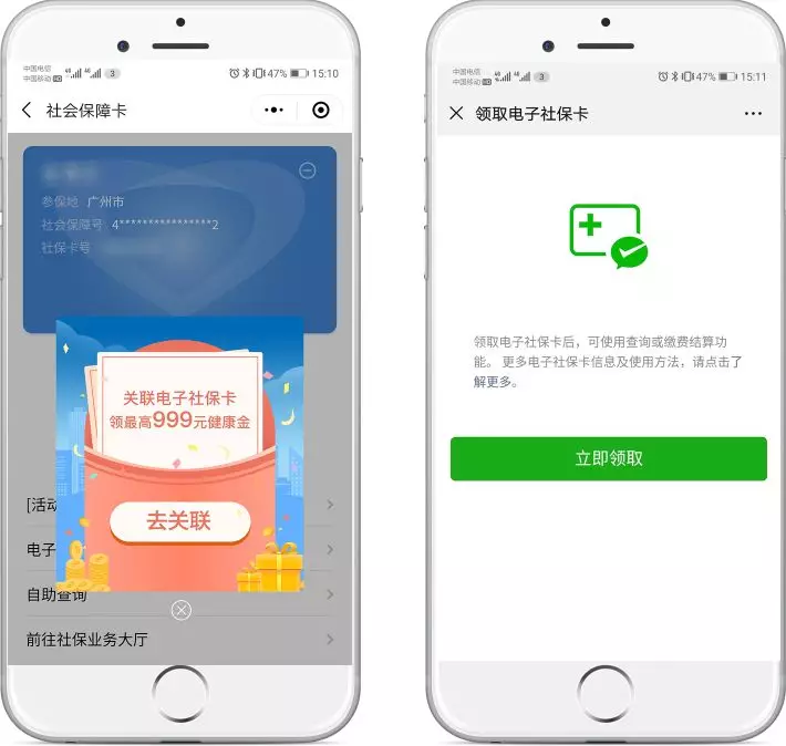 關(guān)聯(lián)完成后,點擊彈窗領(lǐng)取電子社保卡,在電子社保卡領(lǐng)取頁面點擊“立即領(lǐng)取”。