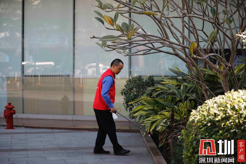 2019年11月22日,福田區(qū)景田社區(qū),一位義工正在將草叢中的垃圾撿出。