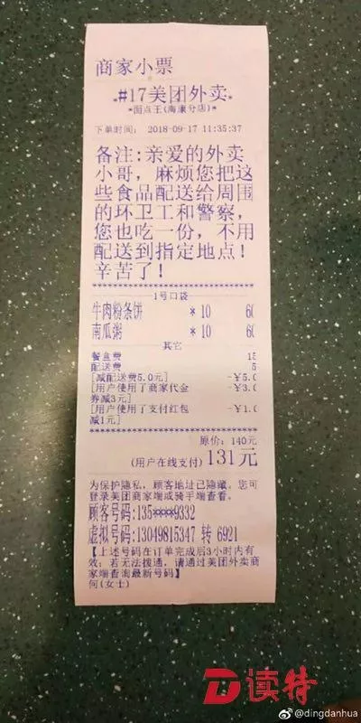 千元外賣送給環(huán)衛(wèi)工和警察