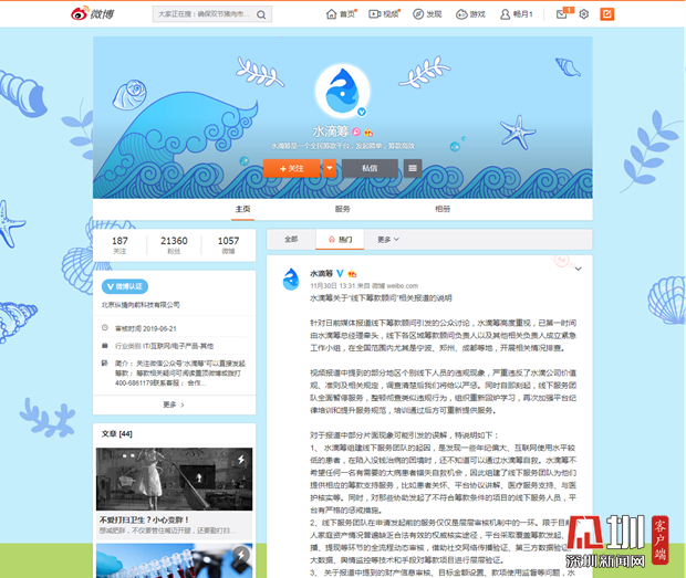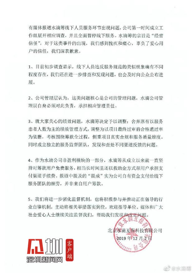 見圳客戶端.深圳新聞網(wǎng)2019年12月6日訊(見圳客戶端、深圳新聞網(wǎng)記者 張玲)2019年11月30日,據(jù)梨視頻報(bào)道,互聯(lián)網(wǎng)籌款平臺(tái)“水滴籌”在超過40個(gè)城市的醫(yī)院派駐地推人員,線下地推服務(wù)人員被指在醫(yī)院“掃樓”尋找求助者,套用模板,隨意填寫金額,不審核甚至隱瞞求助者財(cái)產(chǎn)狀況,鼓勵(lì)患者大量轉(zhuǎn)發(fā)籌款信息。同日,水滴籌通過微博官方認(rèn)證公眾號(hào)回應(yīng)稱,已第一時(shí)間成立緊急工作小組開展相關(guān)情況排查,同時(shí)線下服務(wù)團(tuán)隊(duì)全面暫停服務(wù),整頓徹查類似違規(guī)行為,并對(duì)梨視頻報(bào)道可能引發(fā)的誤解進(jìn)行了3點(diǎn)說明。