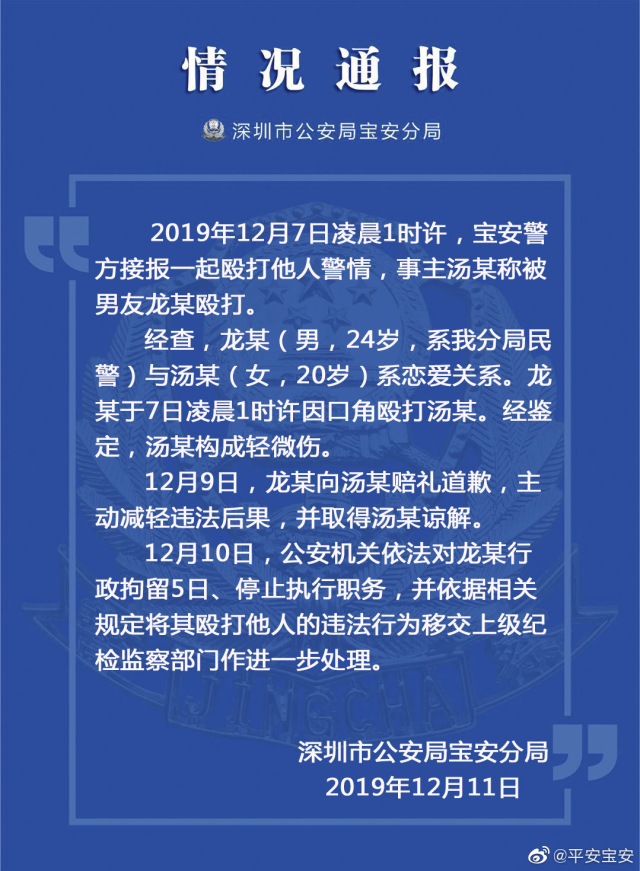 見圳客戶端·深圳新聞網(wǎng)2019年12月12日訊 近日,有媒體報(bào)道了深圳女子被男友從家打到樓道,引發(fā)社會廣泛關(guān)注。12月11日,深圳市公安局寶安分局發(fā)布通報(bào)稱,家暴施暴男子系寶安分局民警,公安機(jī)關(guān)依法對其行拘5日,停止執(zhí)行職務(wù)。
