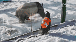 前幾天,一只企鵝坐火車到亞布力景區(qū),和兩只大熊貓“面基”。