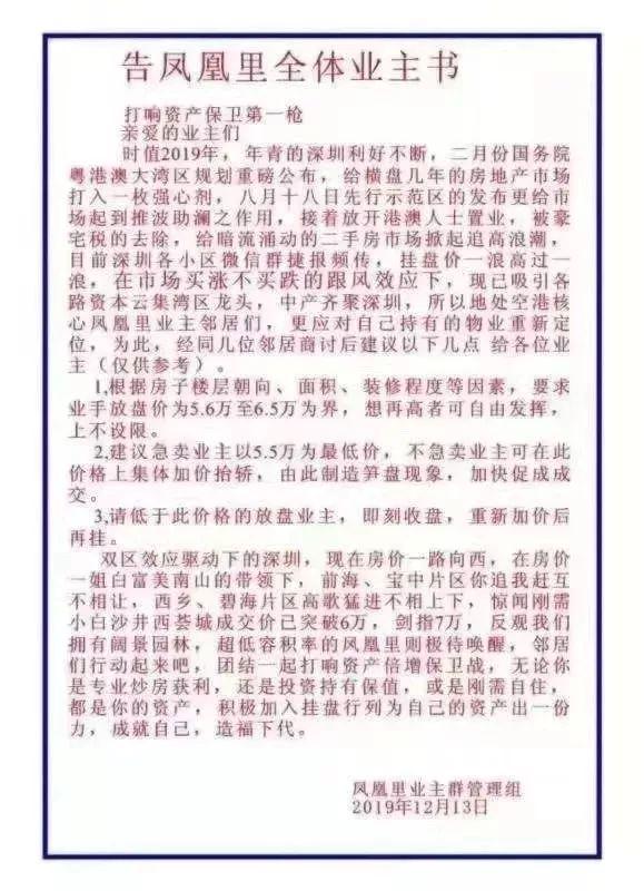 近日,福海街道中糧鳳凰里花苑小區(qū)個(gè)別業(yè)主發(fā)布集體漲價(jià)言論,涉嫌惡意炒作二手房?jī)r(jià),以下為網(wǎng)傳業(yè)主倡議書