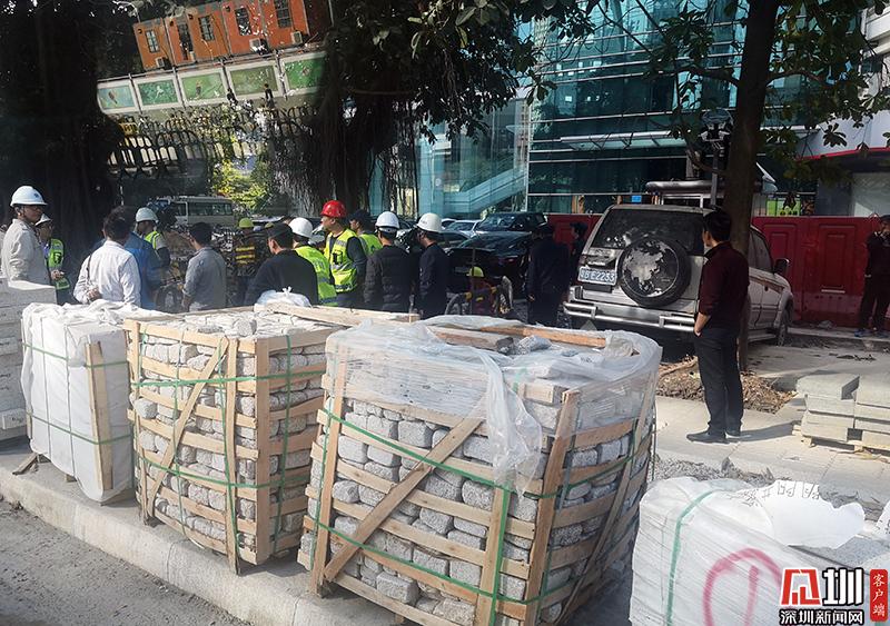 上午10點,深圳市交通運輸局執(zhí)法人員來到福田區(qū)民田路與福華路路口的一處施工現(xiàn)場。記者在現(xiàn)場看到,沿著福華路一側(cè)的人行道基本全部被挖開,建筑工人正在進行人行道石磚的鋪設工作,由于施工圍擋布置不規(guī)范,現(xiàn)場也沒有完善的路線指引,不少市民出行受阻。