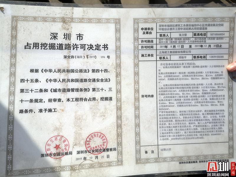 記者在現(xiàn)場了解到,目前該路段正在進行福田中心區(qū)道路品質(zhì)改善提升工程的施工,施工單位為中建七局。從現(xiàn)場的占道施工許可證上,記者看到該項目自2019年8月份開始占道施工,預計2019年12月31日完工。