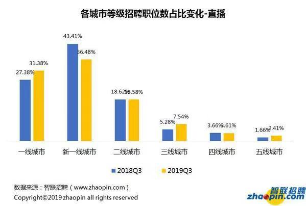 從趨勢上看,短視頻機構(gòu)隨著用戶的下沉也在下沉,而直播領(lǐng)域呈現(xiàn)進一步向一線城市聚集的趨勢。2019年三季度,短視頻行業(yè)在一線城市的招聘需求占比較去年同期下降了7.21個百分點,新一線、二線、三線等比例均有提高;直播行業(yè)在一線城市的招聘需求占比則是提高了4個百分點。(記者 莊瑞玉)