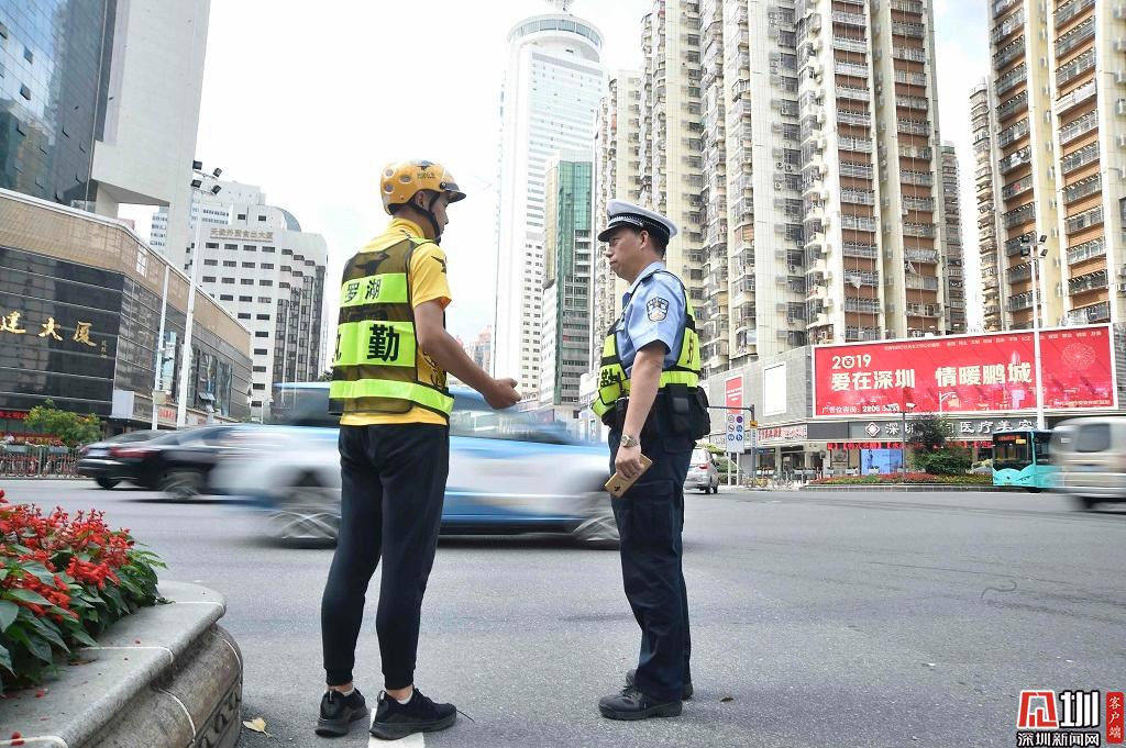 2019年4月23日,深南東路,深圳交警開展和外賣小哥角色互換的活動(dòng),美團(tuán)外賣小哥趙春曉正在路口執(zhí)勤。