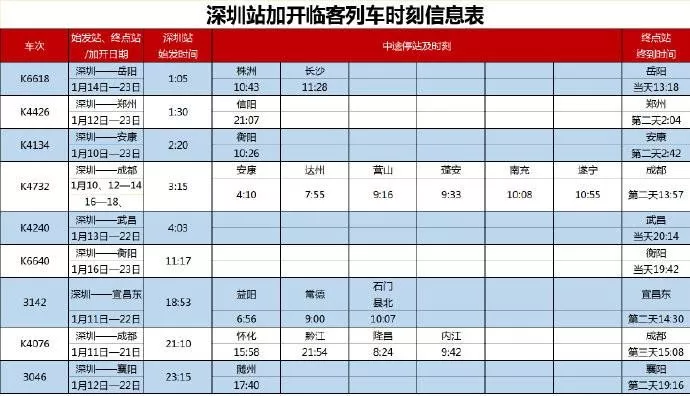 深圳站加開的9趟臨客列車分別開往四川、陜西、河南、湖北以及湖南等地。