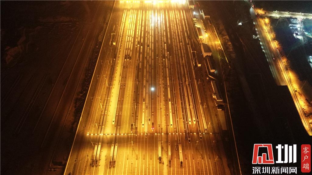 1月15日凌晨,深圳動車運(yùn)用所內(nèi)的存車庫航拍畫面。